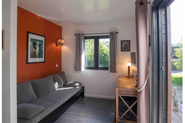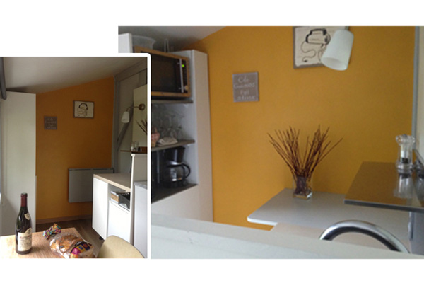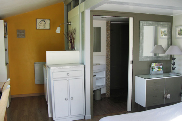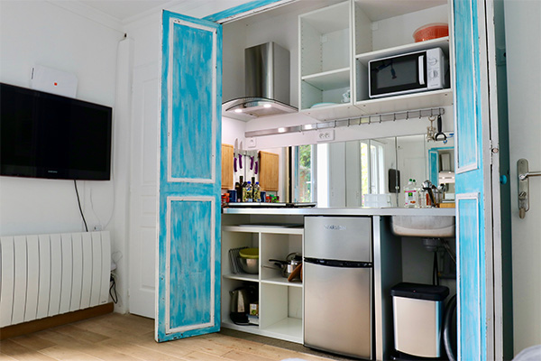Totalement indépendante, avec salle de bain, WC, kitchenette, un four multi-fonctions, table à induction, réfrigérateur, lave-linge. Dans la pièce à vivre une télévision avce accès internet gratuit. un lit double et en mezzanine un lit simple pour un enfant.