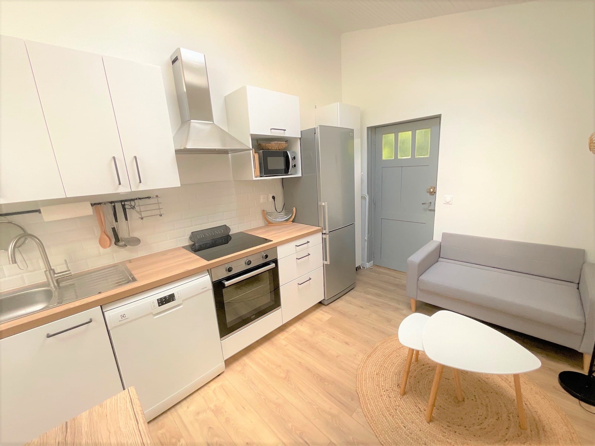 Deux chambres, salon avec deux canapés, cuisine, salle de bains et à 100 m de tous les commerces et restaurants.