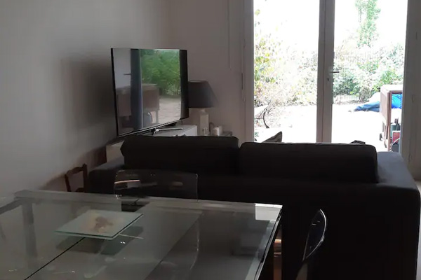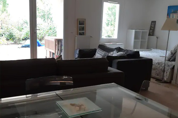 Centre commercial 4 mn à pied, canapé convertible 140 cm avec matelas Bultex 16cm, Kitchenette, douche, lave linge, sèche linge, terrasses privative sur un jardin arboré de 800 m2.