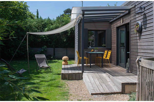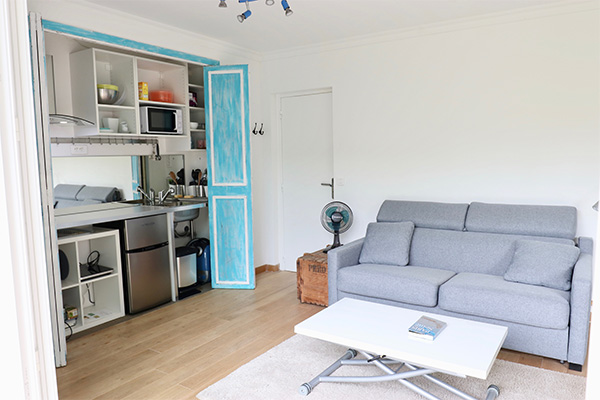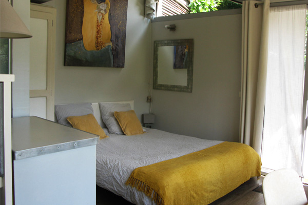 Centre commercial 4 mn à pied, canapé convertible 140 cm avec matelas Bultex 16cm, Kitchenette, douche, lave linge, sèche linge, terrasses privative sur un jardin arboré de 800 m2.