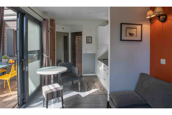 Totalement indépendante, avec salle de bain, WC, kitchenette, un four multi-fonctions, table à induction, réfrigérateur, lave-linge. Dans la pièce à vivre une télévision avce accès internet gratuit. un lit double et en mezzanine un lit simple pour un enfant.
