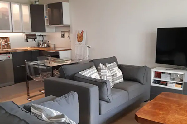 Deux chambres, salon avec deux canapés, cuisine, salle de bains et à 100 m de tous les commerces et restaurants.